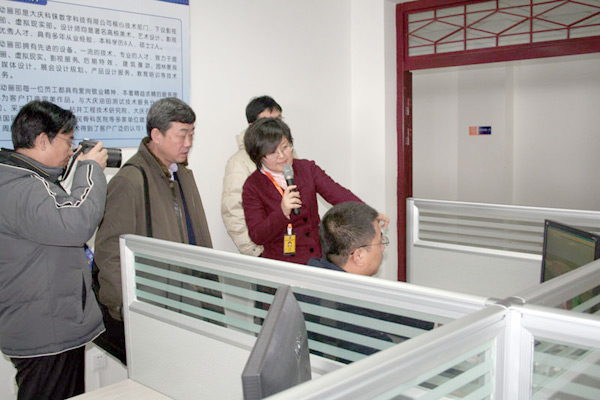 11月16日,中国文化产业司副司长在省文化厅产业处负责人,大庆市市委书记,大庆外包服务园负责人等领导的陪同下莅临公司实地视察。  董事长邹晶虹女士,为领导讲解并演示了油田三维动画及虚拟现实的应用。