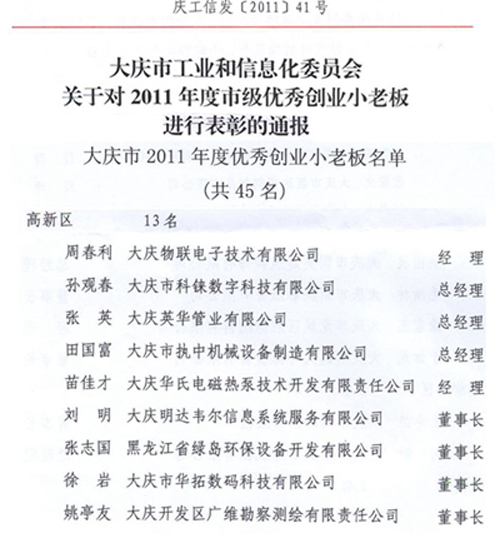 在大庆市小老板创业竞赛活动中,大庆市科铼数字有限公司总经理孙观春以绝对优势获得了2011年度市级优秀创业小老板表彰。对此我们表示热烈的祝贺这也是全体科铼人的骄傲。
